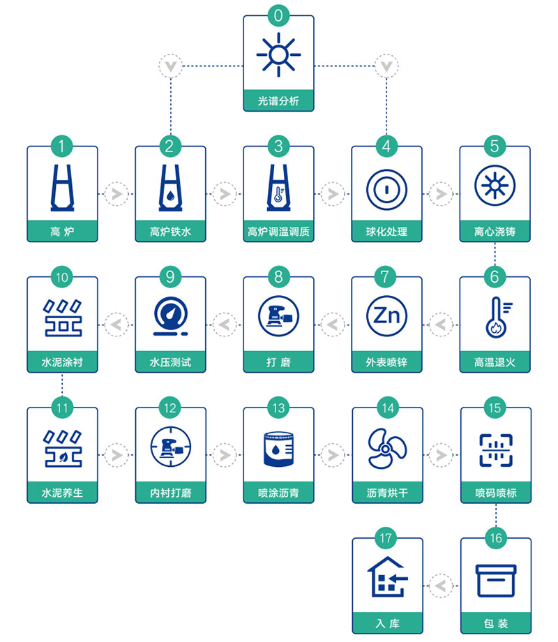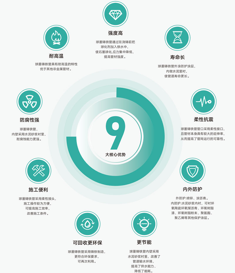 球墨鑄鐵管是指鐵水經(jīng)添加球化劑后,經(jīng)過離心球墨鑄鐵機(jī)高速離心鑄造成的管材。球墨鑄鐵管中石墨是以球狀形態(tài)存在的,克服了片狀石墨對鐵基體連續(xù)性的阻止作用,使鐵具有了卓越的可延性、柔韌性和抗沖擊性,因而材料本身的機(jī)械性能得到了較好改善,具有鐵的本質(zhì)、鋼的性能。
